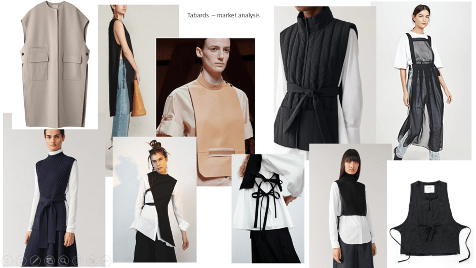 A strand of our business proposal is to facilitate workshops within the exhibition spaces (see blog post 5) but it wasn’t until 5 weeks into the project that I suggested some overalls might be useful for workshop attendees to wear and as a potential revenue stream. This proposal was well received by my teammates and I began visual research. I considered existing products that I had seen artists wearing when painting within the studio and gathered images of aprons, artist smocks, tabards and boiler suits.