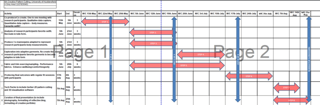 Before writing the project brief and Gannt chart for this module, I re-read my Research Proposal and assessment feedback from December 2021. This proved to be an invaluable experience as I was reminded of my initial ambitions for the project and the context of the final output. The assessors commentary suggests that I address the way in which I curate the final outcome through practice, literature and conference opportunities to shift societies focus from the physical appearance of our elders to respect for lived experience. It also suggested that I look at cellular ageing, fabric ageing and rejuvenation processes as well as other forms of longevity in support of broader transdisciplinary contexts and approaches that might offer unexpected innovations. Both the presentation/curation of the output and exploration into fabric ageing/rejuvenation are areas that I have failed to explore and make a note to address this in my upcoming work.