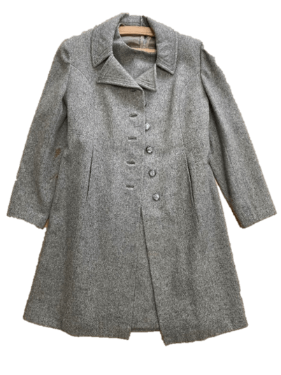 Interviewer; OK, so Barbara, the garments that you have leant me is a beautiful wool grey shift dress with coordinating overcoat. Can you tell me a little bit about this outfit? What year did you wear this?